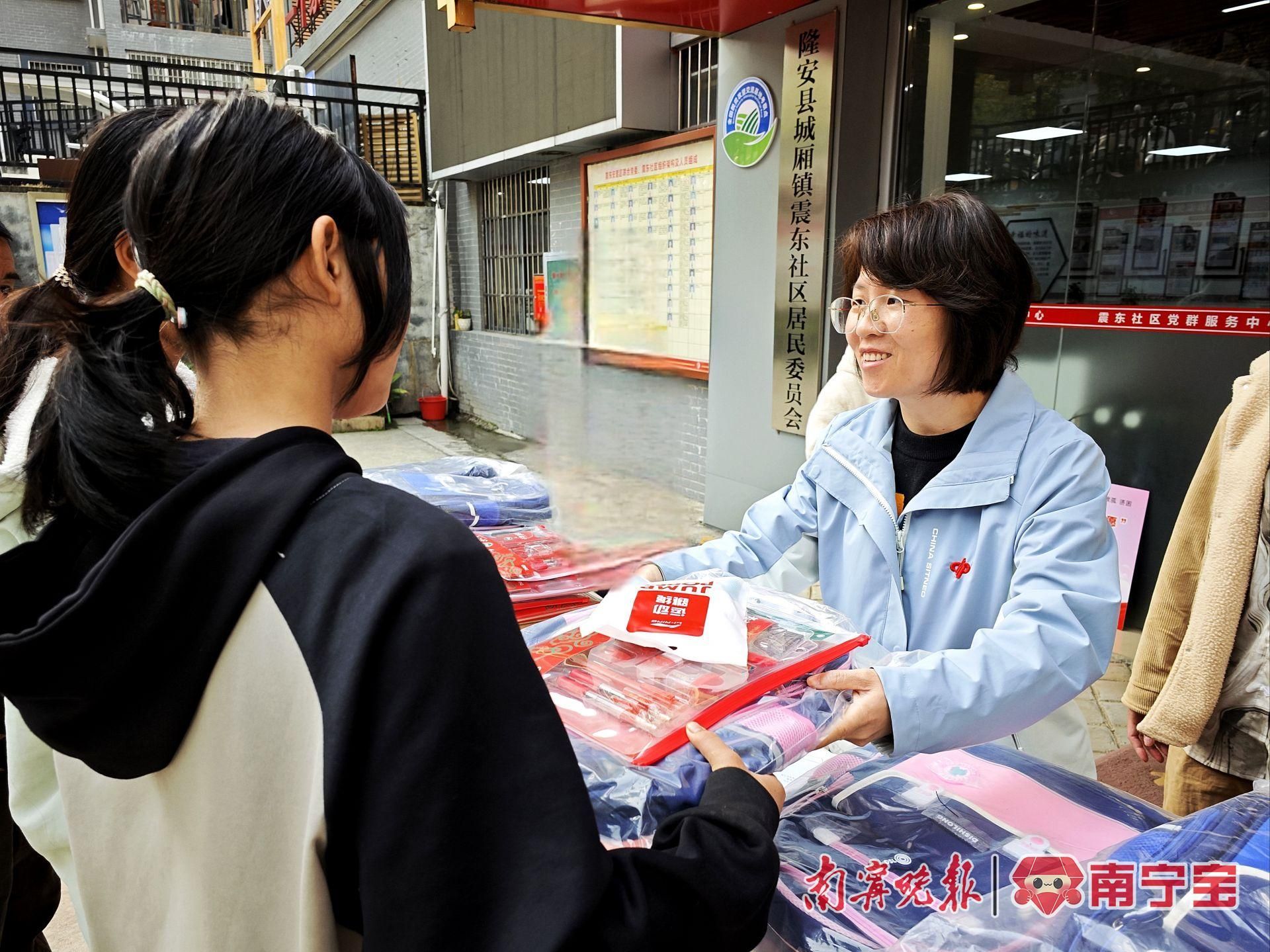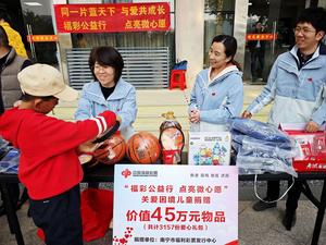 南宁市福彩中心工作人员为受助儿童发放“微心愿”礼物。