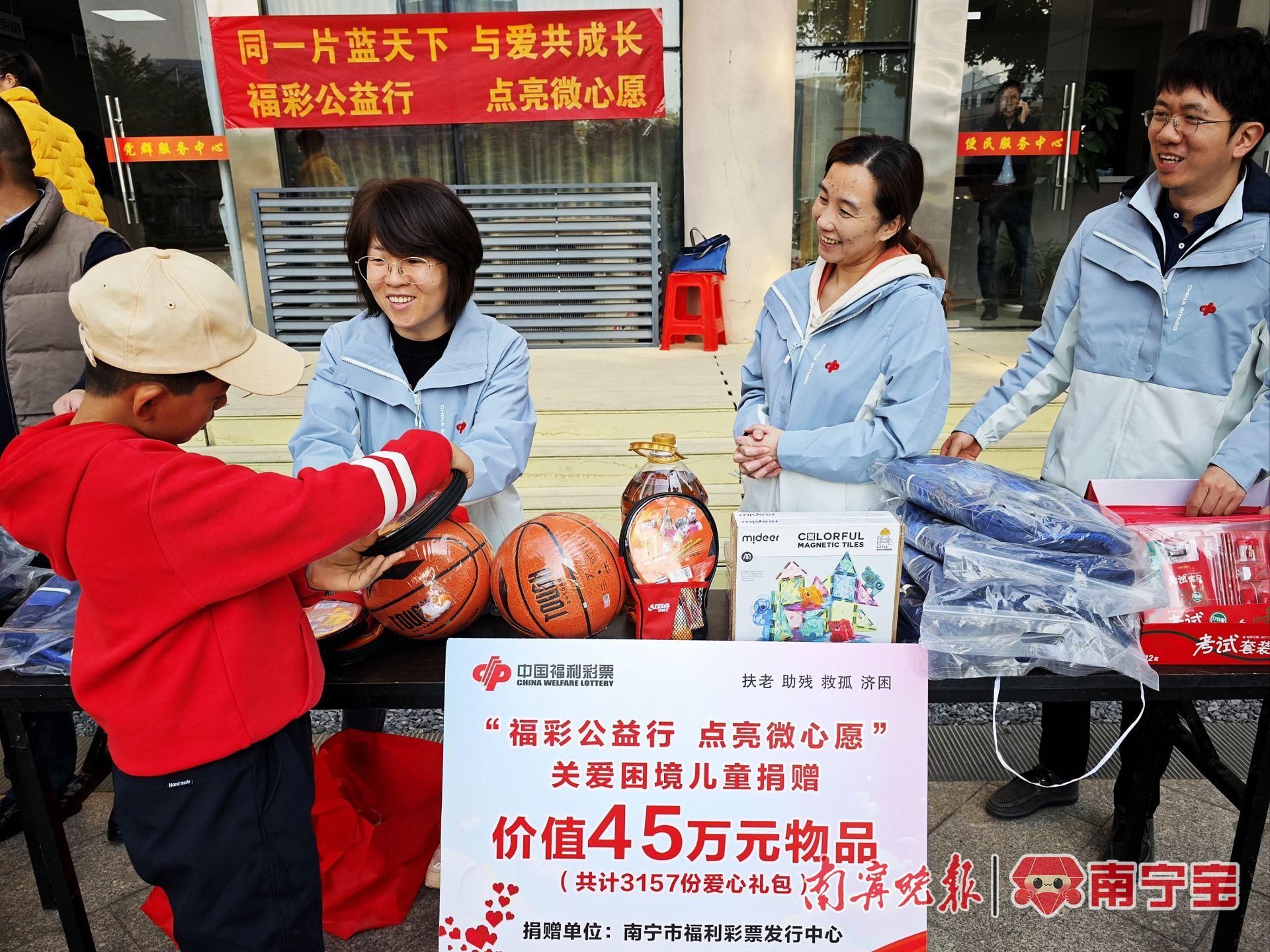 弘扬福彩公益文化,履行福彩社会责任。近日,南宁市福利彩票发行中心开展“福彩公益行 点亮微心愿”关爱困境儿童捐赠活动,为南宁市12个区县3157名困境儿童送上米、油、文具、体育用品、益智玩具等物品,用爱心助力困境儿童圆梦“微心愿”。